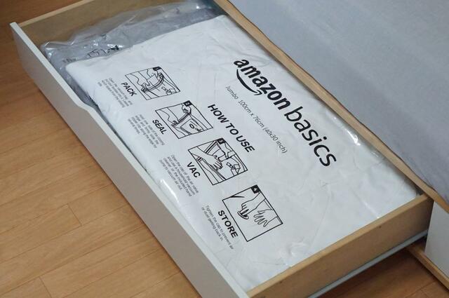 半分に折ると、IKEAのベッド下引き出し収納にピッタンコ!使わない時にここに隠れておいてもらって、使う時はすぐに取り出せてGOODです。