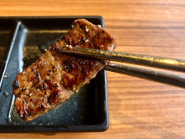 卓上にタレが5種類置いてあるので、好みのタレをチョイスしましょう! 筆者は塩+レモンだれが好きなので、まずはタン塩をレモンだれにくぐらせてパクリと一口。コリコリした食感と脂が少ないからこそダイレクトに感じられる肉の旨味が格別で、一人でニコニコしながら食べちゃいました。