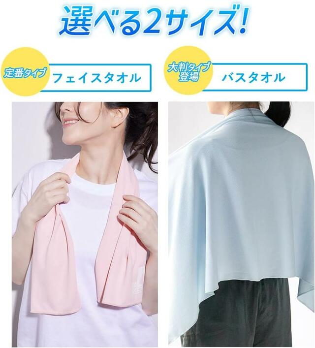 95cm×30cmのフェイスタオルサイズと110cm×60cmのバスタオルサイズの2種類から選べるので、用途に合わせて使い分けが可能。通勤・通学時の熱中症対策から、スポーツやフェスなどのアウトドアシーンまで幅広く活躍します。