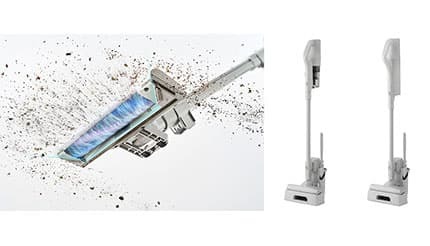本体は、重さ約1.1kgと軽量で、小型自走式パワーヘッドとの組み合わせで、力を入れることなく掃除できる。また、掃除機をかけつつ棚上のほこりなどを床と同時に掃除が可能で、掃除後は充電スタンド下部に静電モップを差し込むことで除電して、静電モップに付いたほこりを掃除機で吸引できる静電モップクリーンシステムを搭載している。