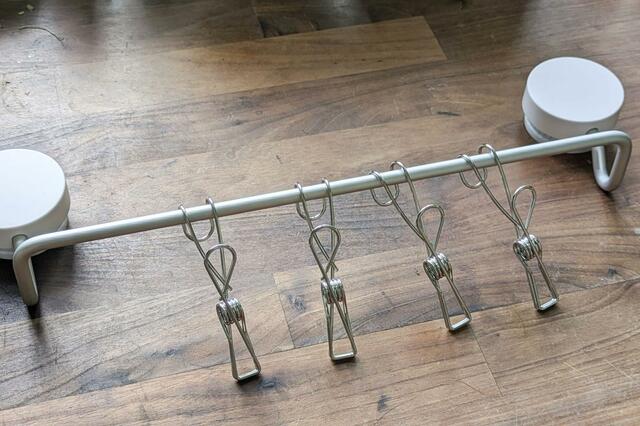 そこにワイヤークリップをかけるだけで収納が完成。