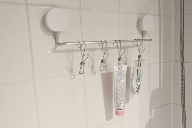 クリップになっているので、なかなか引っ掛けづらかったチューブタイプのものもしっかり吊るすことができるんです。