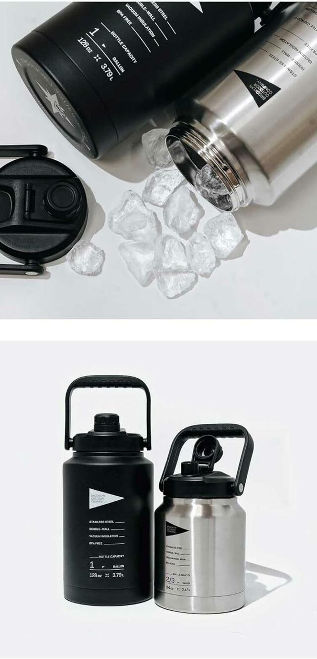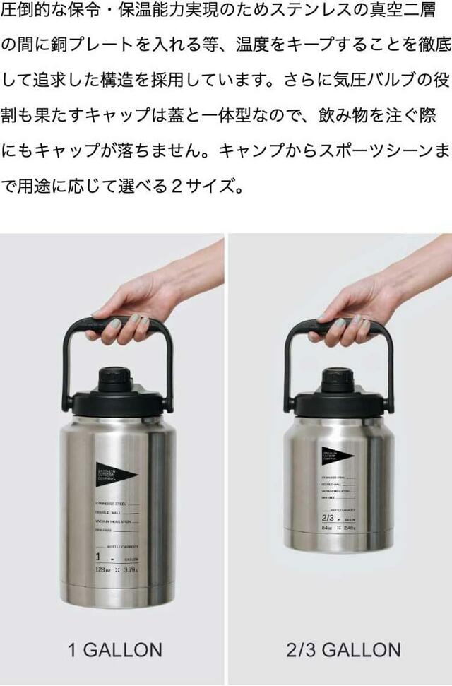 「The Cool Jug」のサイズ展開は、1ガロン(約3.8L)と2/3ガロン(約2.5L)の2サイズ展開で、人数やシーン、用途に合わせて選ぶことができます。