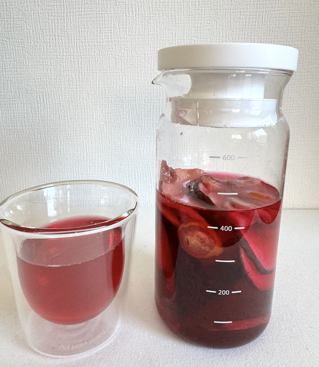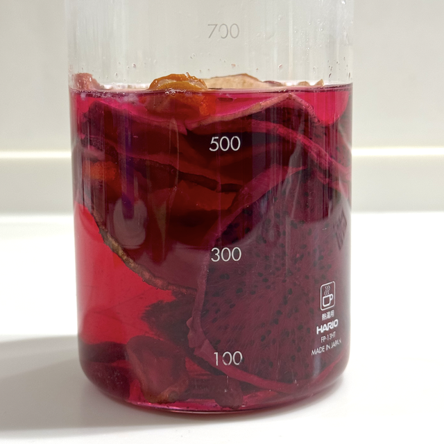 説明書きのオススメの分量である600mlの水を入れて30分ほど冷蔵庫に入れると、しっかりと赤い色が出ます。ベースのお茶は紅茶ですが、フルーツの風味が強く、紅茶の存在感はありません。