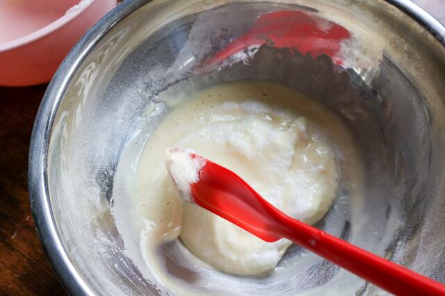 その他の材料を混ぜておいて、2回くらいに分けてメレンゲを追加したらさっくりと混ぜましょう。