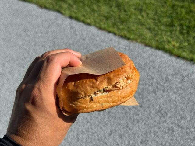 歯応えのある独特な風味の生地に、ツナとオリーブを挟んだサンドイッチ。