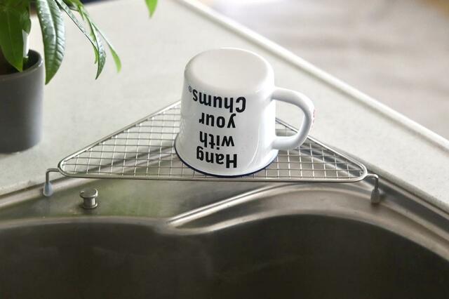 家事問屋の「水切りコーナーラック」。三角の水切りラックは珍しいですね。