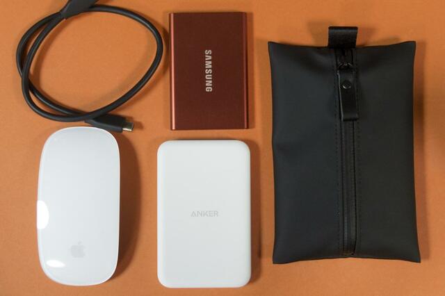 まずガジェットポーチとして使ってみます。モバイルバッテリー、SSD、マウスを入れてみると……