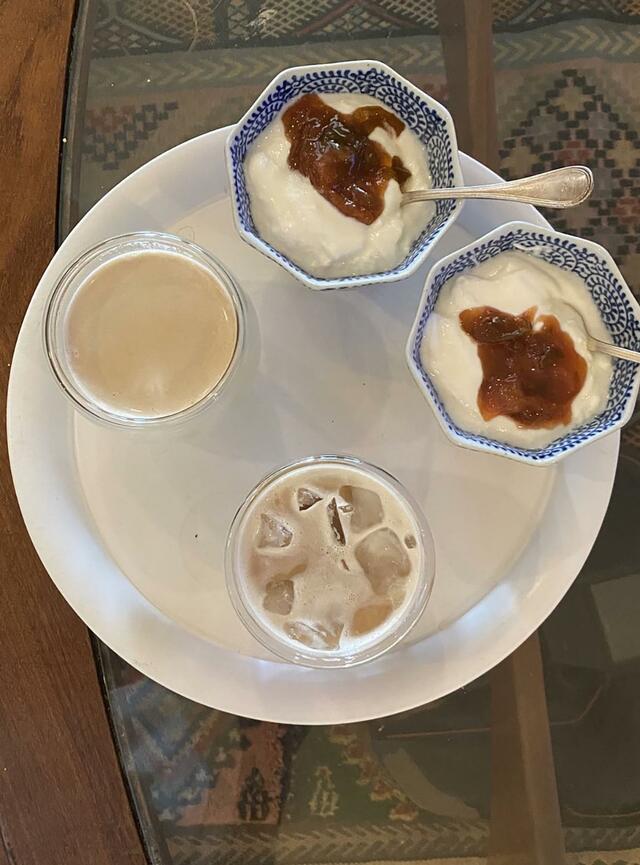 冷たいcafé au lait、ソルダムジャムとヨーグルト。