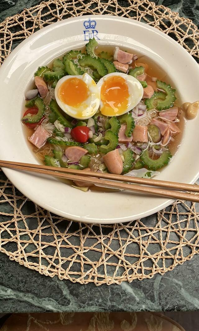 冷やし中華そば風の素麺(半熟卵、ソーセージ、ゴーヤー、トマト)。素麺、こういう食べ方もいいね。酸味のあるタレとよく似合う。