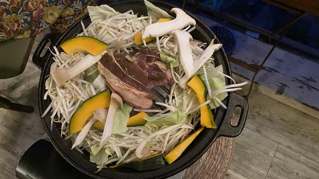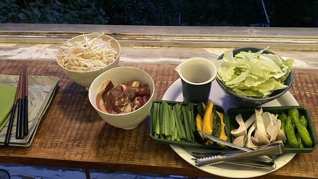 今夜はジンギスカン。マトン、もやし、キャベツ、ニラ、かぼちゃ、エリンギ、ししとうを焼いて食べるだけ。