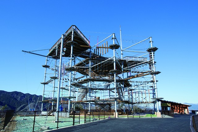 起伏の富んだ斜面に建てられたウッドアスレチックフィールド。ターザンになった気分で、斜面のぼりやいかだ渡りなど陸上、水上合わせて12種類のアクティビティをクリアしよう。