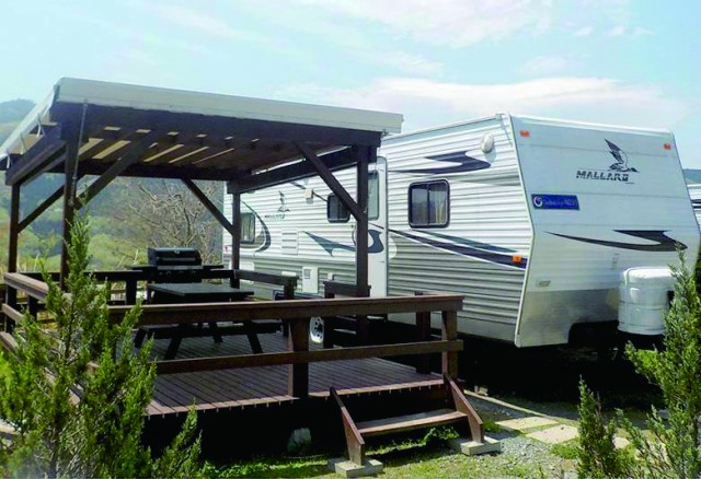 遊園地内にあるキャンピンググラウンド。設備充実のトレーラーハウスやログキャビン、オートキャンプまで、様々なキャンプスタイルを楽しめる。