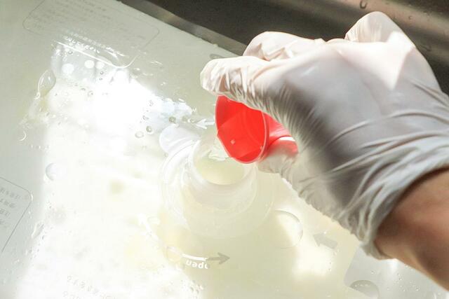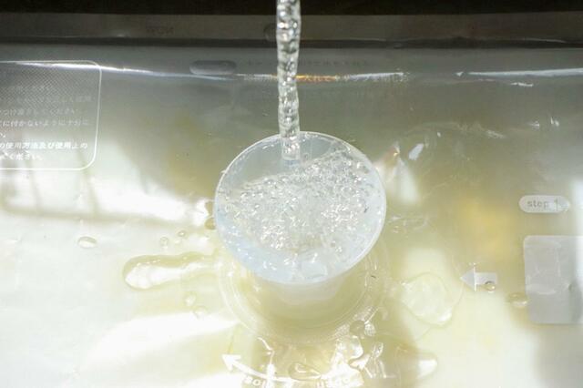 続いて、袋についている穴にじょうごを取り付けて水を入れます。