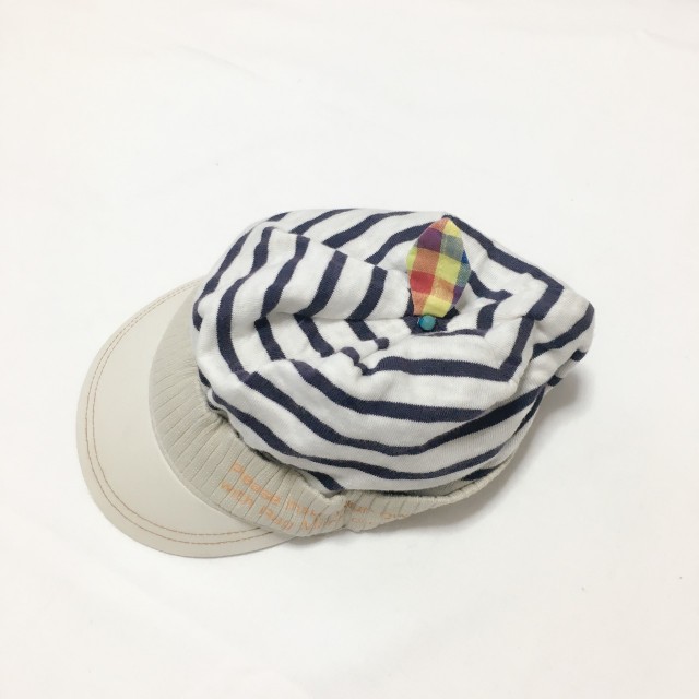 「例えば、写真のキャップは、ボーダー柄で、きれいな色使いの葉っぱのモチーフがついています。シンプルなコーデにこんな可愛いデザインの帽子を加えると、アクセントがついておしゃれに見えます。ほかのママに褒められることうけあいですよ。秋冬ならニット帽もいいですね」