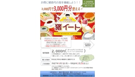 「猪イート」は、2000円で3000円分(500円券×6枚つづり)の食事券として、猪苗代町内の対象飲食店で利用することができる。発行枚数は、町民向け5000セット、一般向け5000セットの合計1万セットとなる。