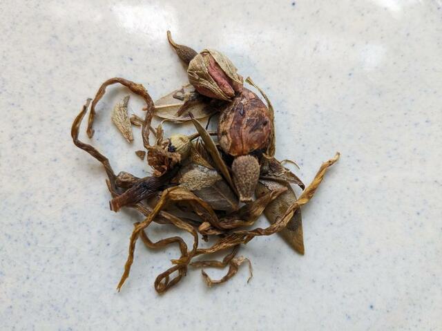 中にはしっとりと濡れた木の実、葉、花びらが入っています。