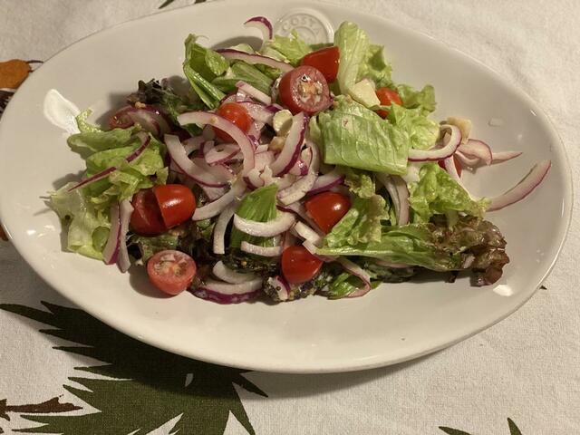 サラダ(紫玉ねぎ、ミニトマト、レタス、ブルーチーズ)と