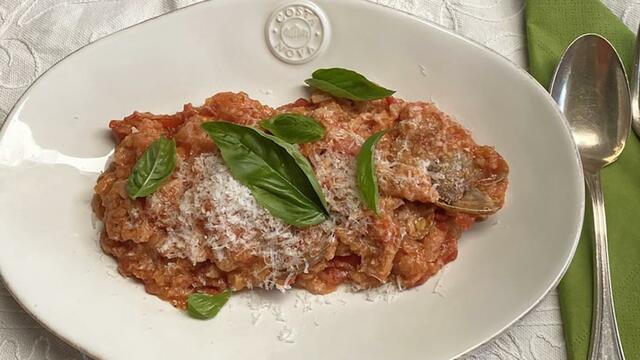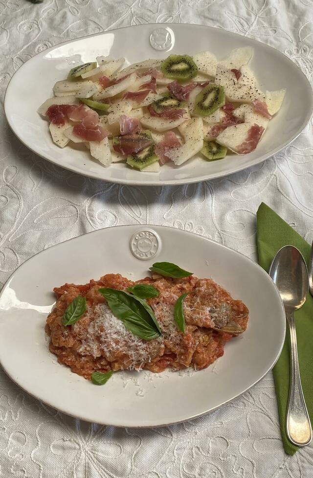 梨と生ハムとキウイのサラダ。パッパ・アル・ポモドーロ(固くなったパンを使って作るパンのトマト粥。今日はアサリ入りです。パルミジャーノも加えました。とても美味しい。固くなったパンがあったら是非作ってみて)。