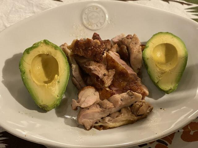 鶏肉のグリル(アボカドのお供)。カリカリに焼けた鶏肉の皮が美味しい。