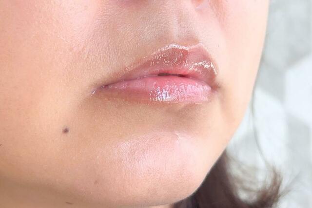 ツヤの反射で光を集めて、唇の凹凸が目立ちにくくなるような印象です。