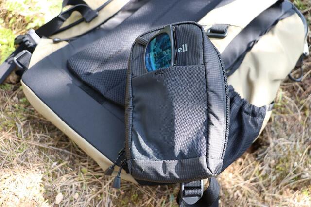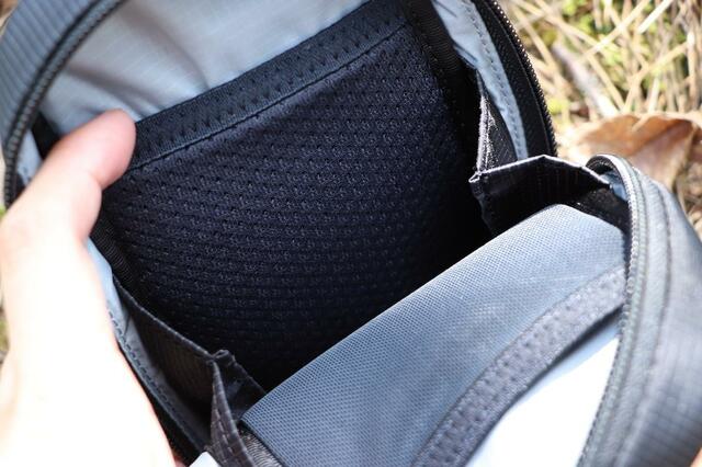 まず、フロント部分にはメッシュのポケットがあり、スマホやサングラスを一時的に収納するのに活躍します。