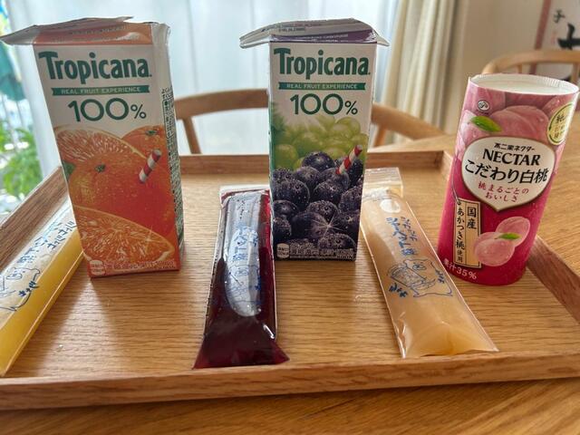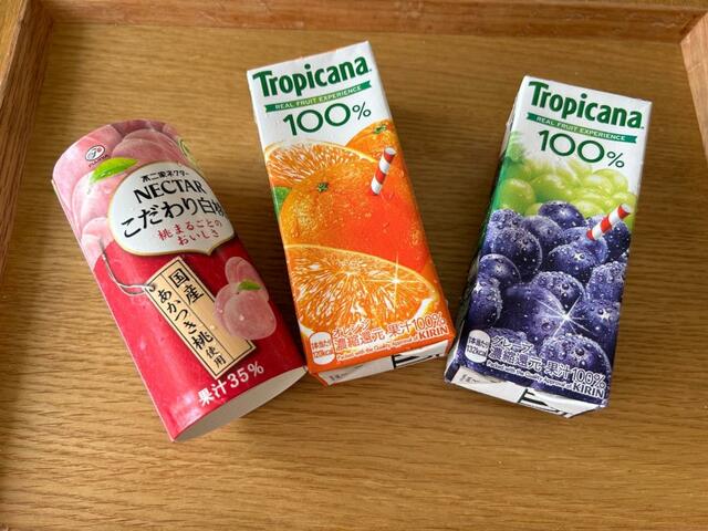 試したのは「トロピカーナ 100%まるごと果実感」のオレンジ、グレープ、そして「不二家ネクター こだわり白桃」の3つです。
