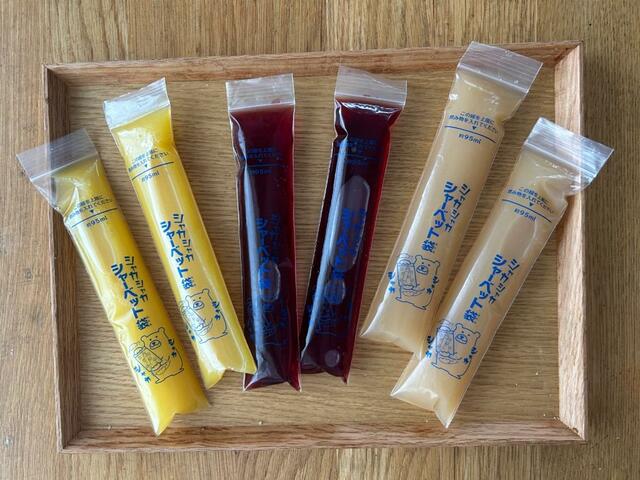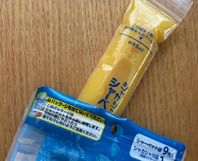 シャカシャカ袋(本体パッケージ)と、材料のジュースを入れるシャーベット袋の2つから構成されています。