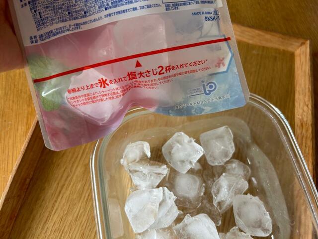 シャカシャカ袋(本体パッケージ)の指定の線の上まで氷を入れて、塩を大さじ2杯加えます。