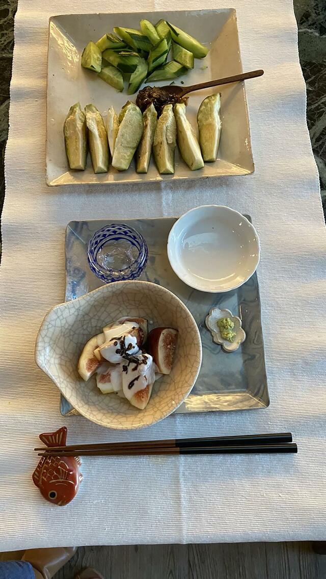 イチジクの塩麹とヨーグルト和え、キュウリと水ナス(梅醤つけて)、