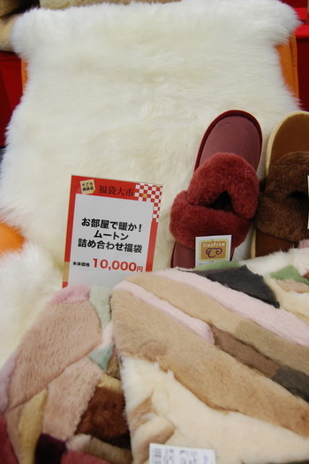 インテリアではウール(羊毛)をたっぷり使った「お部屋で暖か!ムートン詰め合わせ福袋(限定5個、1万円)」はスリッパやクッションなど計5点で、3万円のコース(限定5個)もある。