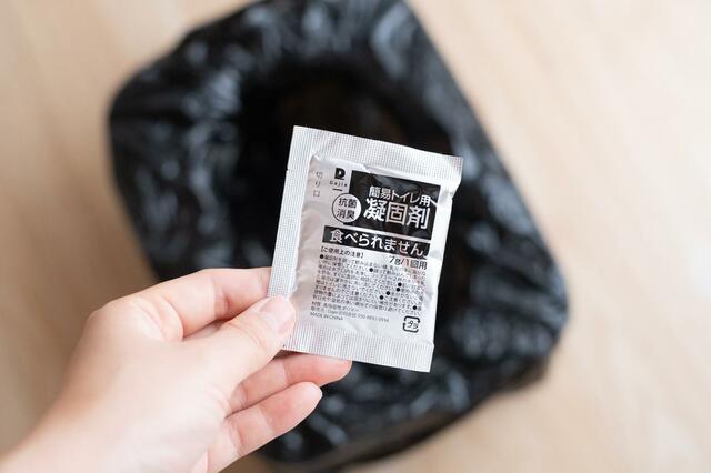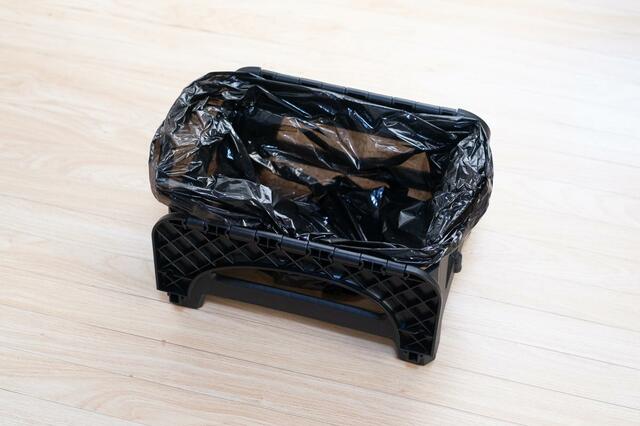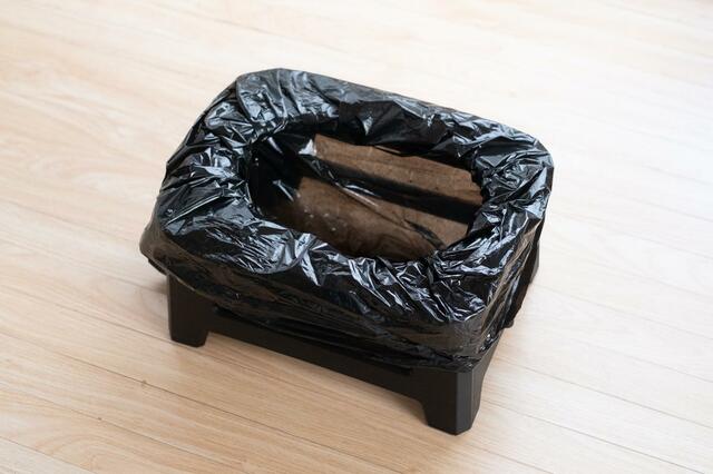 使い終わったら、凝固剤を入れて袋を縛って片付け完了。袋をしっかりトイレがホールドしてくれるので、手を汚さずに片付けられます!