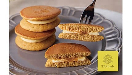 今回、販売が開始となったパンケーキ~キャラメル~は、T.D.Earlyのロングセラー「パンケーキ~メープル~」の新ラインアップ。ふわふわに焼き上げたパンケーキに、甘く香ばしい風味とまろやかな甘さが魅力のキャラメルクリームを贅沢にサンドしており、手のひらにそっと収まる上品なサイズは、紅茶とともに気軽に楽しめる。