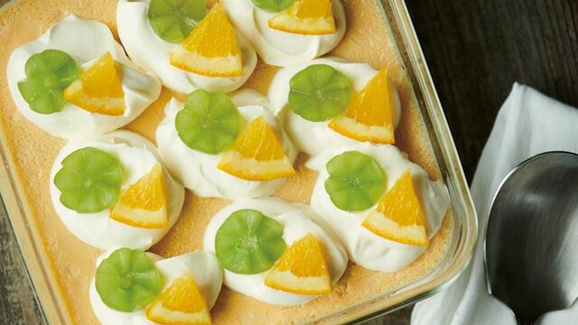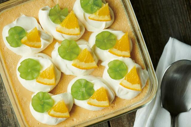 8. 粗熱がとれたら冷蔵庫で3時間冷やす。お好みで7~8分立ての万能クリーム(本書p42)や即席万能ソース(本書p70)、フルーツを飾る。