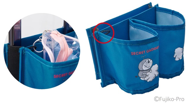キャリーケースとバッグをひとまとめにできる便利グッズで、ドラえもんの手形デザインがかわいくて印象的。