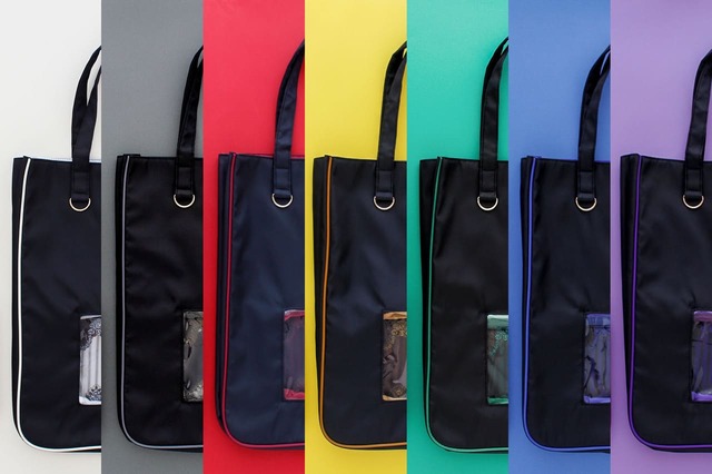 トートバッグ(約43×35×10cm、5,500円)は、ブラックがベースの7色展開。前面クリア仕様で“見せる収納”が可能な仕様に。