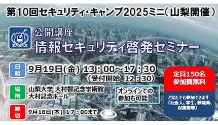 セキュリティ・キャンプ協議会は、「第10回セキュリティ・ミニキャンプ 2025ミニ(山梨開催) 公開講座」を9月19日13時から実施する。会場は、山梨大学大村智記念学術館大村記念ホール。参加費は無料で、だれでも参加できる。定員は150名。オンラインでの参加も可能だ。専用応募フォーム「セキュリティ・キャンプ2025ミニ(山梨開催)公開講座 申込フォーム」で参加申し込みを受け付ける。締め切りは9月18日17時。