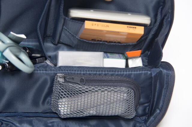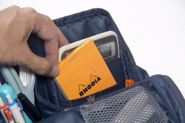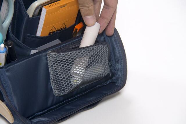 スティックのりや修正テープなどはL字ファスナー付きのメッシュポケットに入れて、