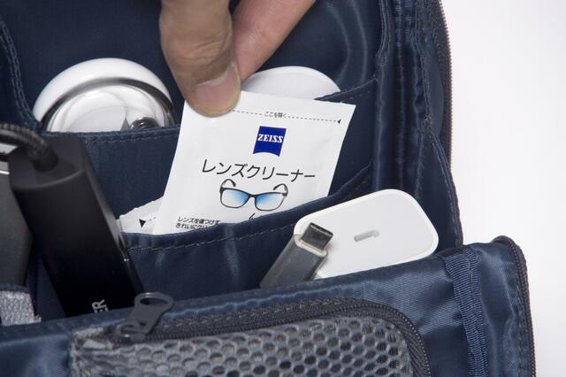 メモ帳を入れていたポケットには画面などを拭けるクリーナーを入れて、ケース入りのクリップを入れていたところにUSBハブや電源アダプタを。