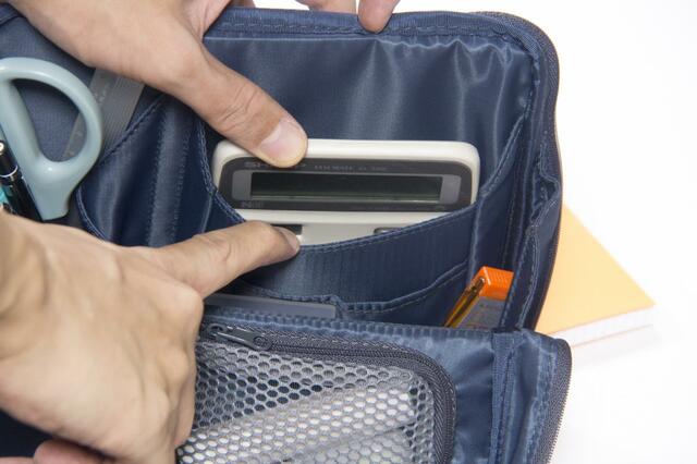 そこそこ厚みがある電卓は奥のポケットへ。マチのあるポケットなので無理なく収納できました。