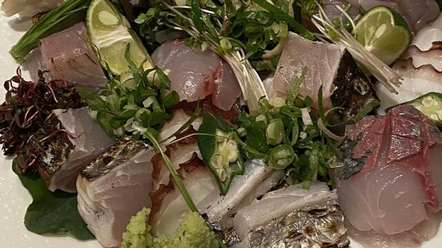 葉山町の「割烹 真」で友房夫妻と食事。前菜の盛り合わせ、