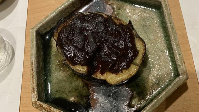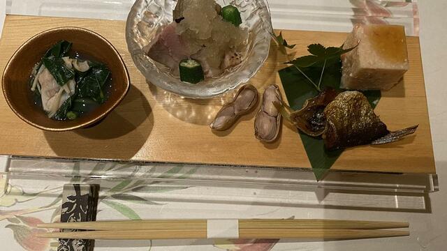 米ナスの味噌焼き、カラスミ、蛸と水ナス、白えびの唐揚げ、牛肉と野菜のジュレ、
