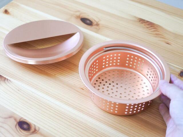 最初に紹介するのは、下村企販の「純銅ゴミポケット 浅型」と「銅製 排水口カバー」。
