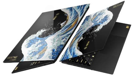 新製品は、990gのモバイルノートPC「Prestige 13 AI+」に、「岡田や漆器」の職人による伝統工芸の技術を用いて、特殊なデザインを施した特別なモデル。世界的に有名な浮世絵「神奈川沖浪裏」にインスパイアされた絵柄となっており、次世代AI PCのテクノロジーと日本の漆・蒔絵の伝統工芸を融合させた点が大きな特徴だ。