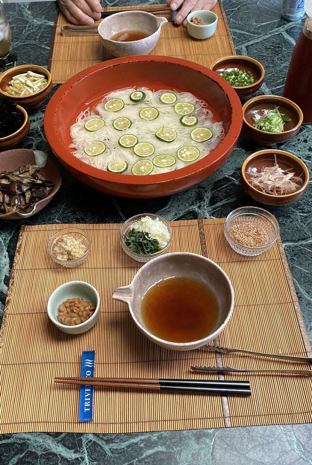 暑い、暑いと言いながら、夏向きごはんの素麺を何日も食べていなかった。おとといすだちを買ったので、素麺の上にのせる。油揚げ、納豆、小ネギ、きゅうり、ミョウガ、海苔、生姜、大葉、すりごま、ナス炒め。
