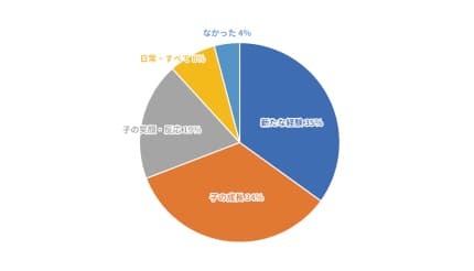 調査結果によれば、育児を通して「楽しかったこと」としては「親としての新たな経験」(35%)がもっとも多く、「子の成長」(34%)、「子の笑顔・反応・行動」(19%)がそれに続いた。
