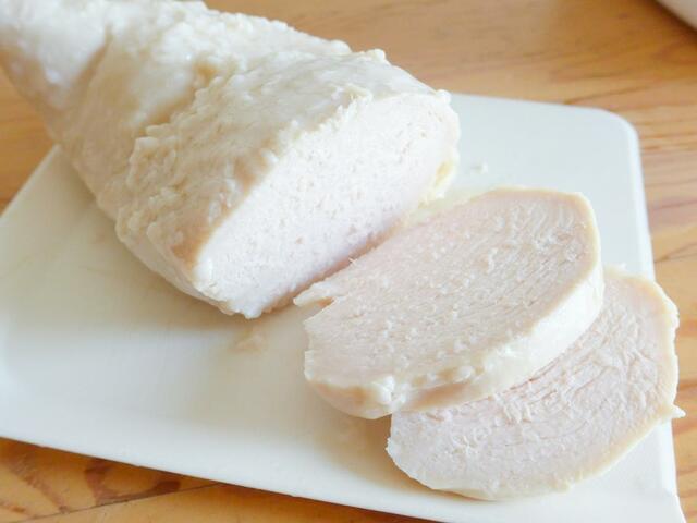 完成したサラダチキンは低温でじっくり加熱したので、断面がしっとり。中華料理店で食べた棒棒鶏のほろほろとやわらかく、ジューシーな食感を思い出しました。