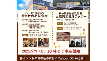 秋の新商品試食会&福岡工場見学ツアーは、9月27日・28日にジョイフル福岡工場・ジョイフルカレッジ(福岡県築上郡築上町)で開催される。
