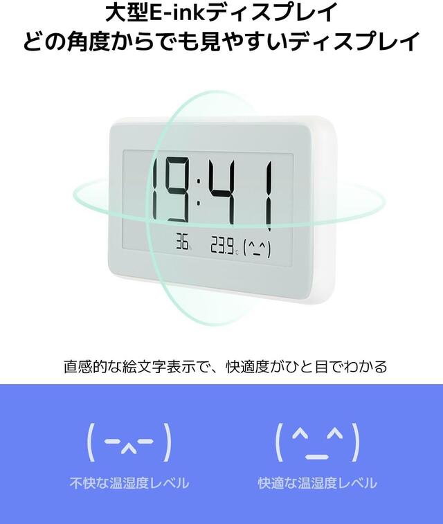 「スマート温湿度計 Pro」は、表示が印刷された文字のように見える「E-inkディスプレイ」を搭載。あらゆる角度から時刻や数値がはっきりと視認できます。