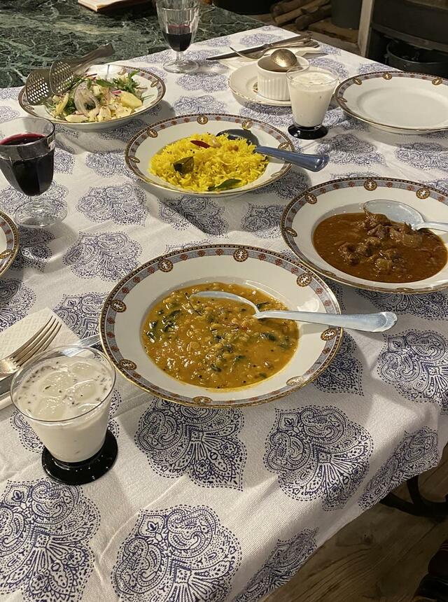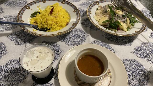 ラッサム(スープ)、レモンライス(以上、Erick South)。サラダ(ルコラ、りんご、アーリーレッド、クミンシード)。ラッシー(ヨーグルト、牛乳、塩、クミンシード)。